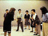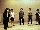 動物の声から始めます。少し、前に体を倒して。言葉を発語しようと思うと、体をつかって声を出す感覚が失われます。「ウオー!」みんなで声を出すと何だかすごい集団みたいです。慌ててドアを閉めたりして。でも、この声が出ないといつまでたっても喉をつかった声になってしまいます。